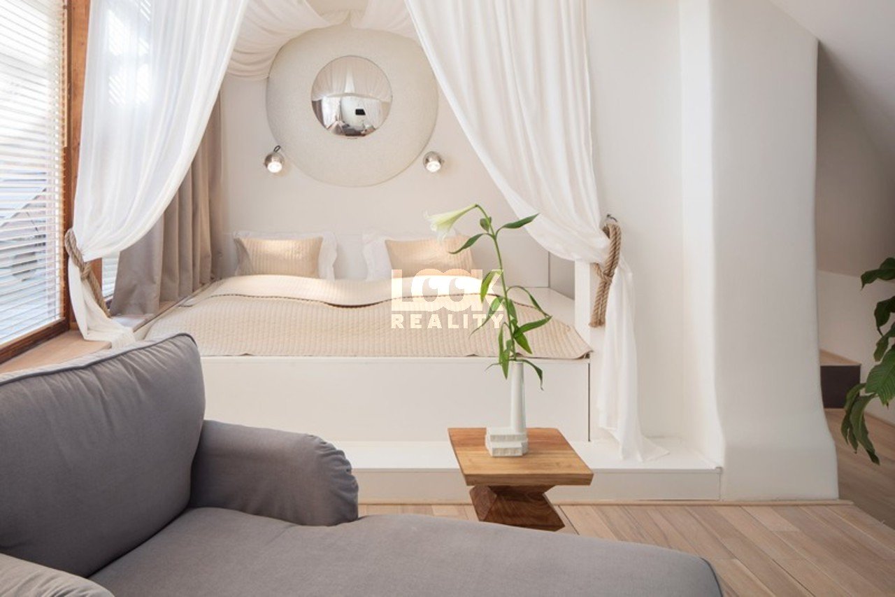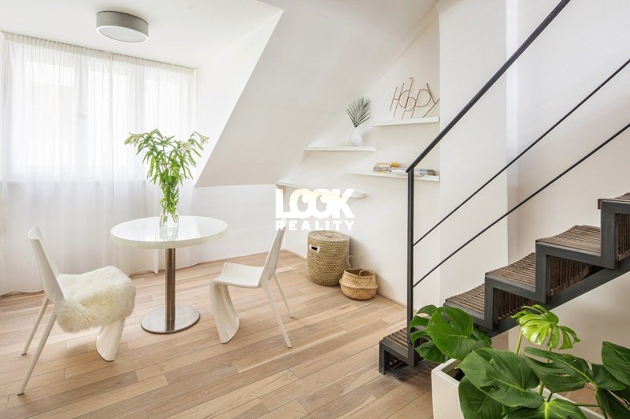 Luxurious duplex with a terrace and a luxuriously furnished bedroom upstairs. We offer for rent a beautiful 1+1 duplex apartment with an area of 38 m2, located on the 2nd floor of a building without an elevator on Holeckova Street. The apartment is rented fully furnished with luxury furniture. The upper floor there is a bedroom with a king-size four-poster bed and a living area with a sofa. Downstairs there is a kitchen and dining area with a fitted kitchen, dining area with table and chairs. There is also a TV/SAT, air conditioning, bathroom and toilet, and a wardrobe in the hallway. Internet access is available, and cleaning is provided once a week. There is also a reception desk. The apartment is located in a popular area in the center of Prague. Nearby are the Petrin Lookout Tower, Kinsky Garden, and nice places for walking and relaxing. Complete civic amenities. There are many cafes and restaurants, shops, a post office, and medical facilities in the area. Another advantage is the proximity of the Nový Smíchov shopping center, which offers many shops, services, and a multiplex cinema. Excellent transport accessibility. The U Zvonu tram stop (trams 10, 16, 9) is in close proximity, and the Andel metro station (B) is about a 5-minute ride away. Beautiful living. We recommend it. Short-term rental possible. The price for short-term rental may vary. Available from January 5, 2026.